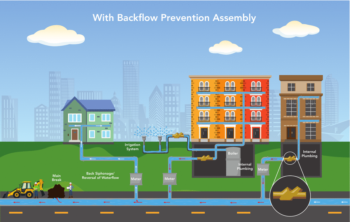 Backflow Prevention Assemblies protect against the possibility of contaminated water flowing back into the public water system. (Graphics courtesy of Denver Water.)